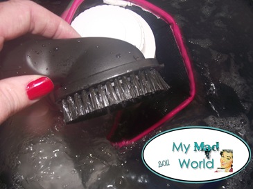 The other day I decided to wash the seat cushion to Mad’s booster seat, which wasn’t the best idea, I soaked it, then I used a brush attatchment from an old vaccuum cleaner. I have no idea why I still had the brush but it worked great to scrub out some of the stains on the cushion. It came out so clean! The only reason I said it wasn’t a good idea to wash was because, of course, it shrank. But it was really clean!!